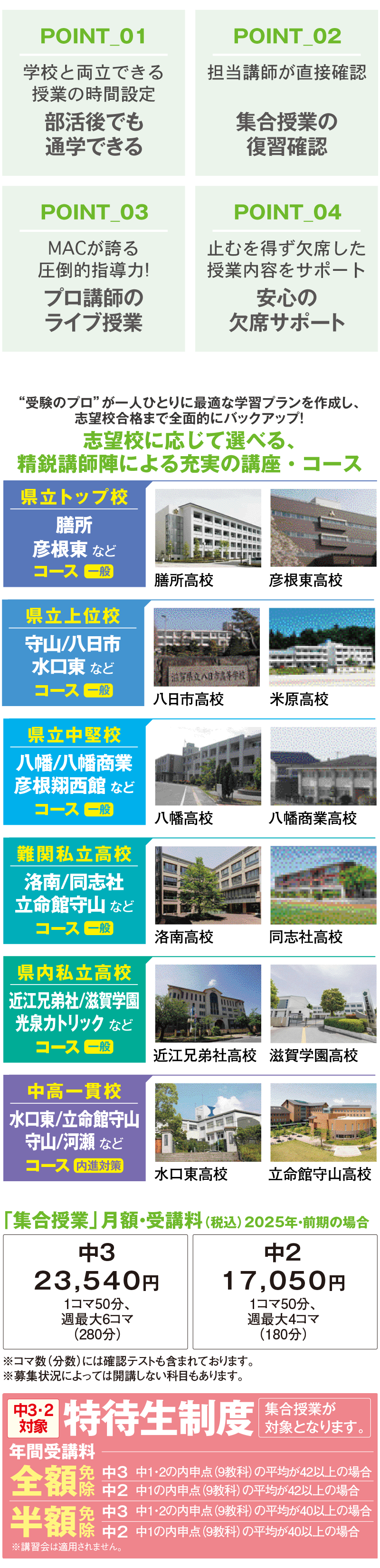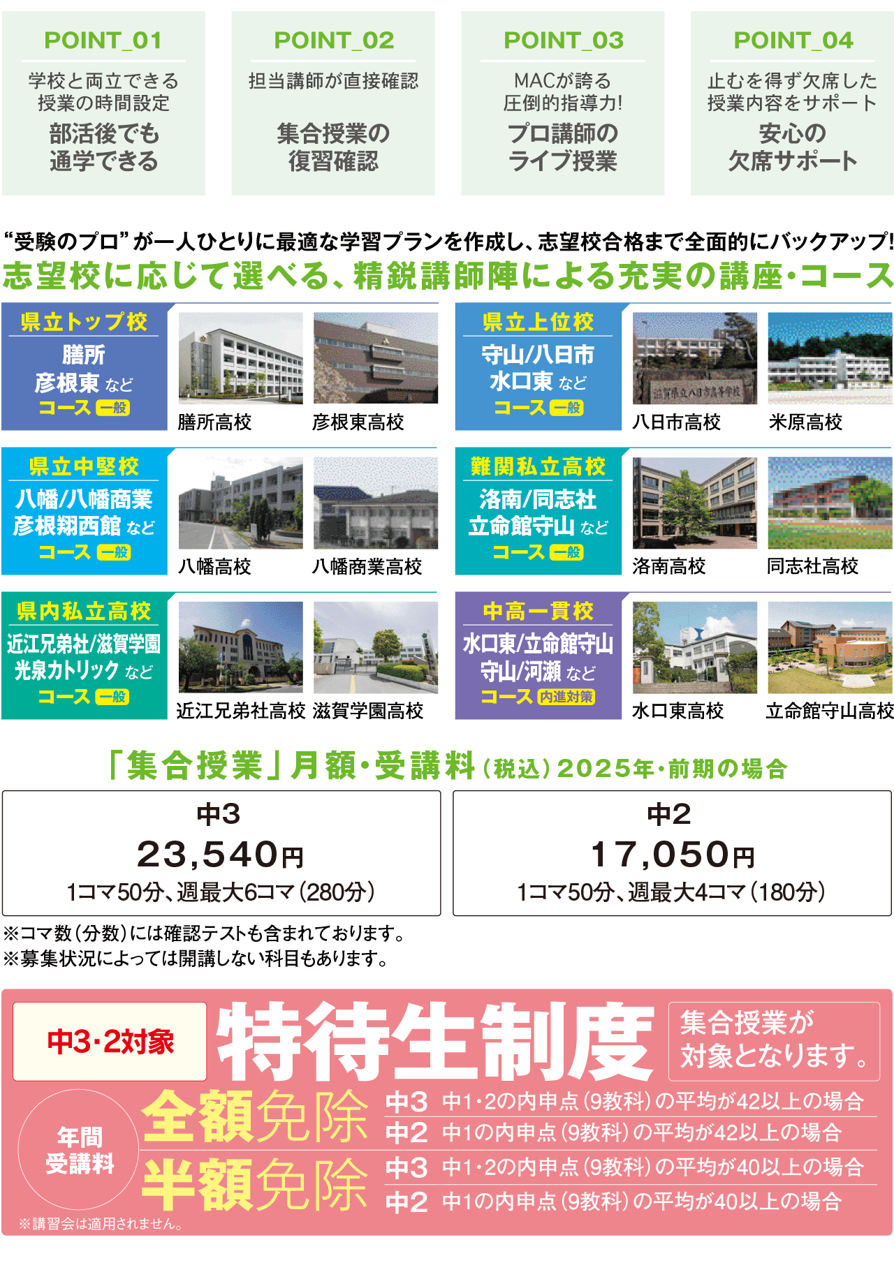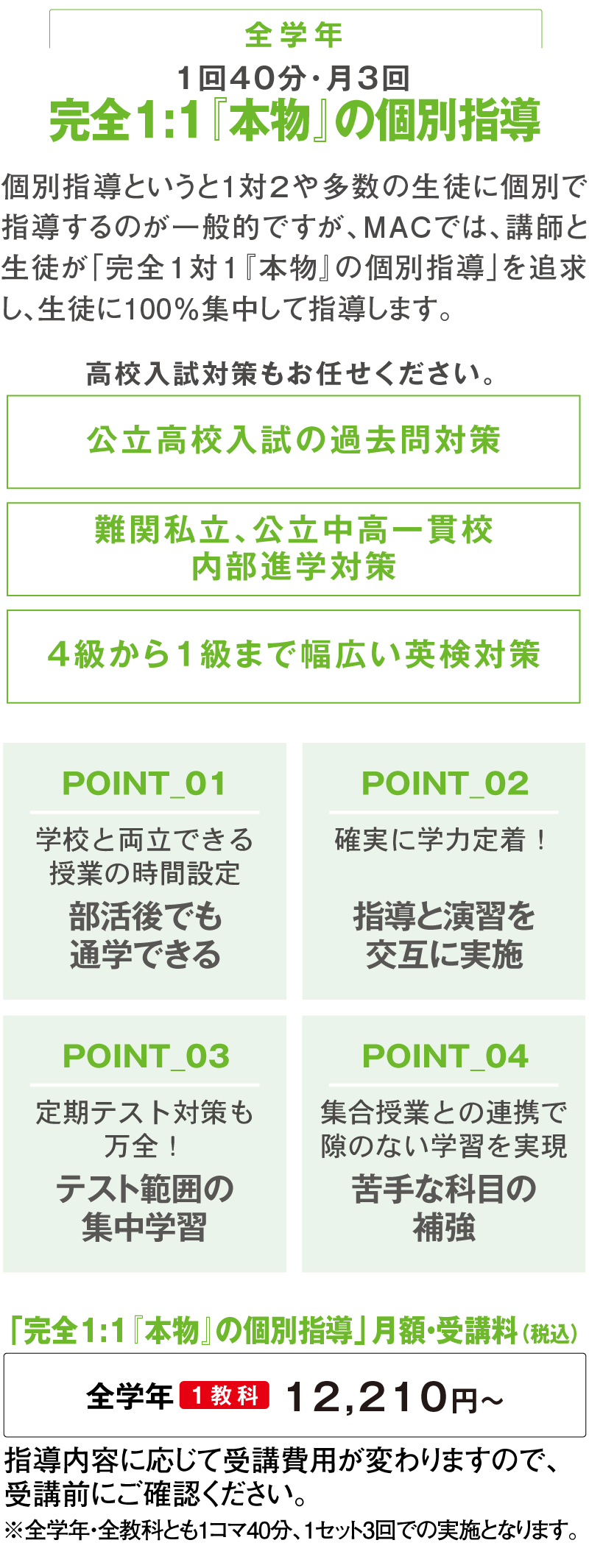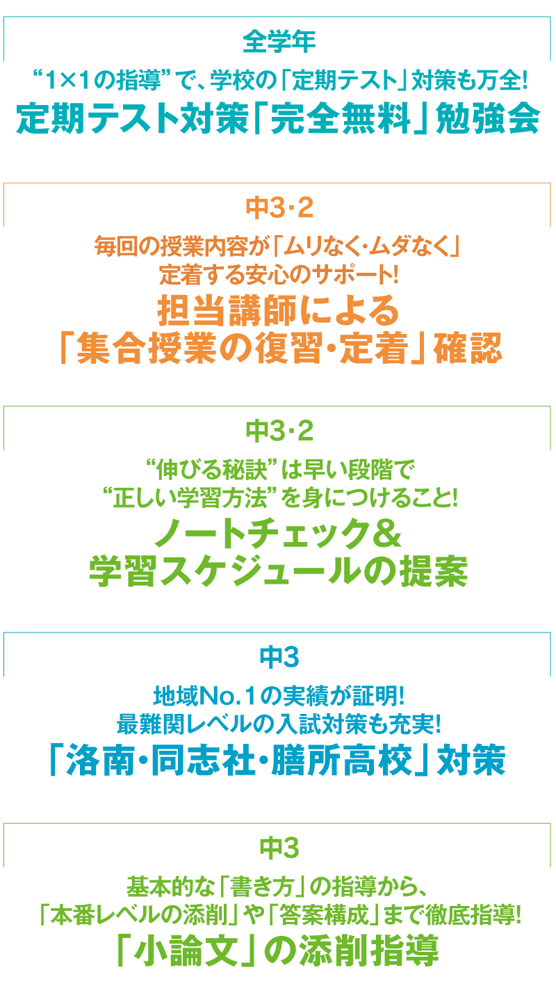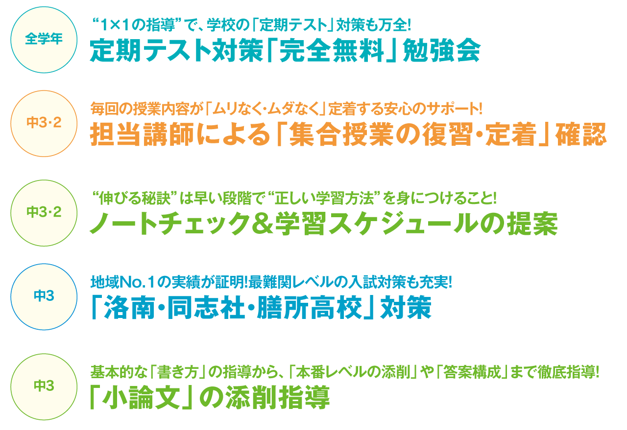 充実のカリキュラムに加え、定着状況の確認として、充実した各種テスト・模試に加えて、授業を担当する講師が一人ひとりに直接確認することで、入試に打ち克つ本物の学力・精神力を養っていきます。